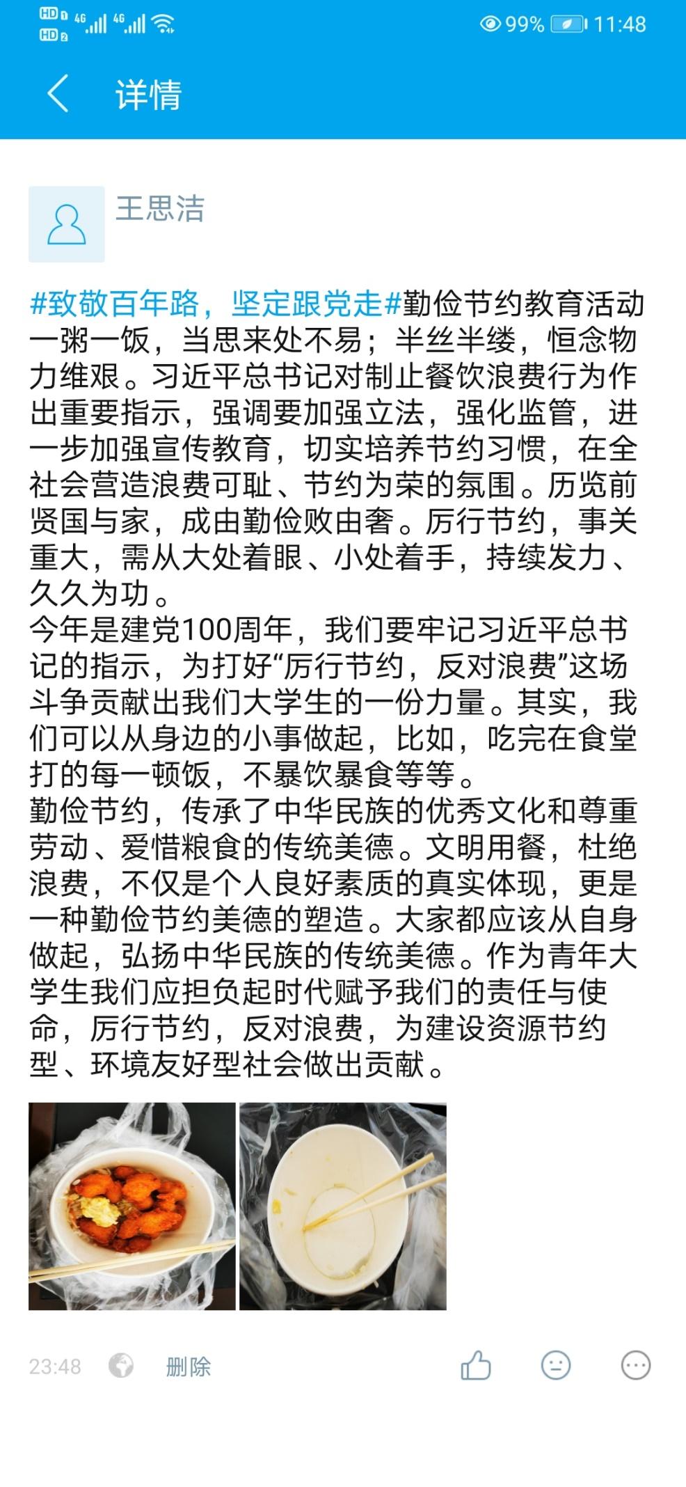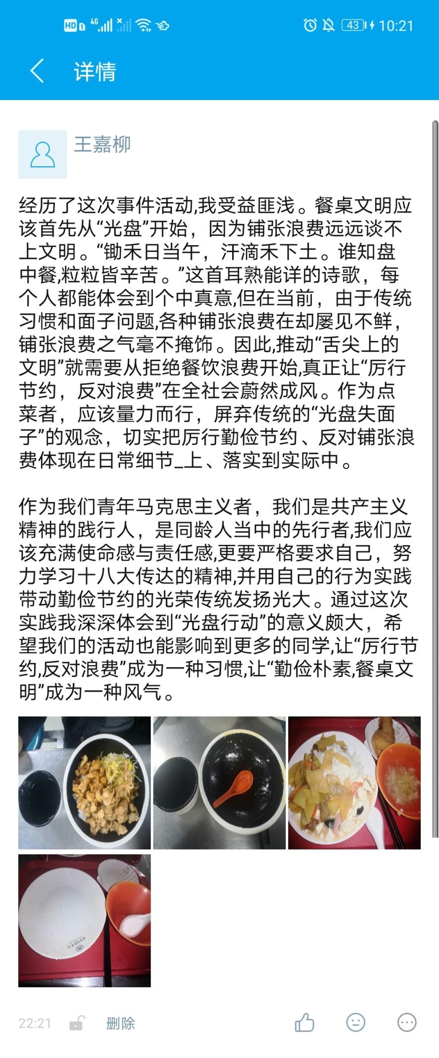在南北苑食堂开展“粒粒辛苦,餐餐光盘”号召,同学们纷纷拍下饭前饭后的对比照,并在易班微社区发表动态,发起“光盘行动”的倡议。