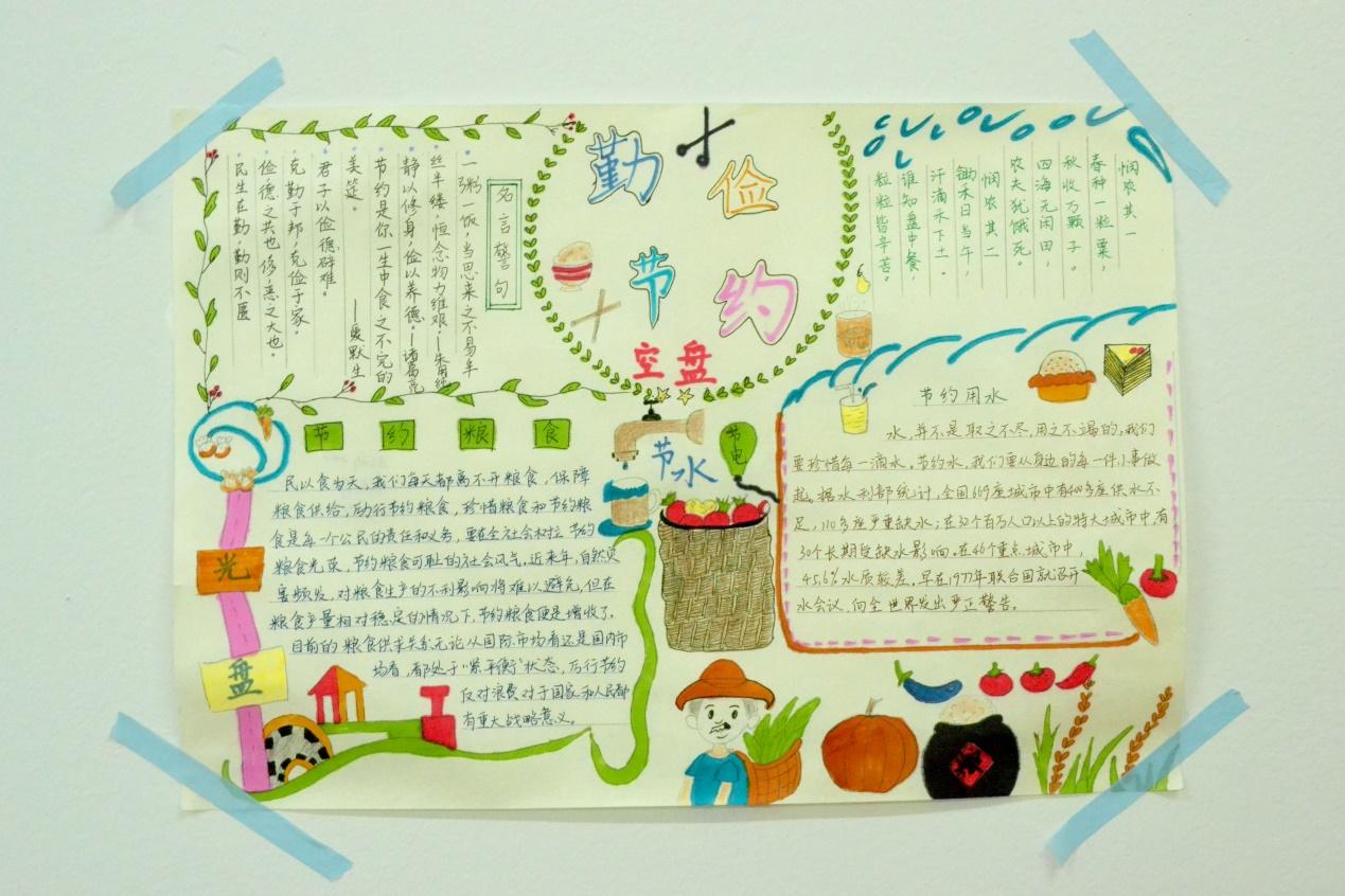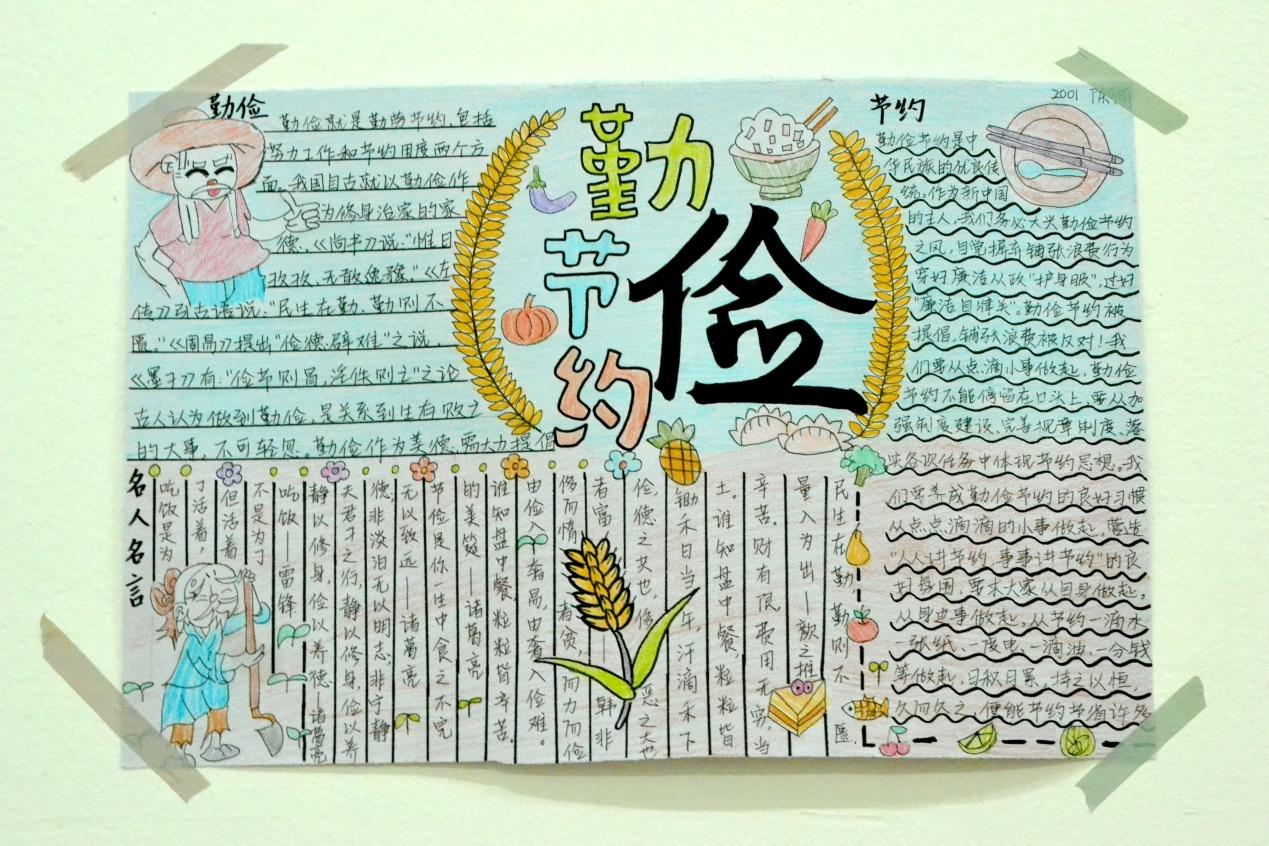 同学们利用课余时间,在宿舍楼区和班级设计相关“勤俭节约”的主题板报。同学们各自发挥自己的特长,合力完成此次的板报设计。