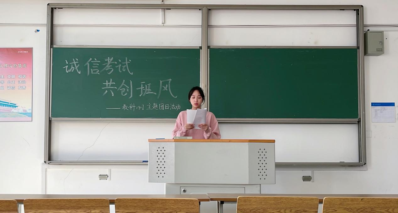 教科1906班团支书用PPT的形式为同学们讲解诚信考试的重要性,引导同学们端正考试态度,以诚信考试为荣,以考试舞弊为耻。接着请同学发表相关看法,分享身边故事,加强同学们的诚信意识,用考风体现班风,用班风展现学风。作弊不仅是对自己实力的否定,更是对学术风气的亵渎。莘莘学子,诚信为本。自觉遵守考试纪律,坚决抵制考试作弊行为,是每个考生应尽的义务。