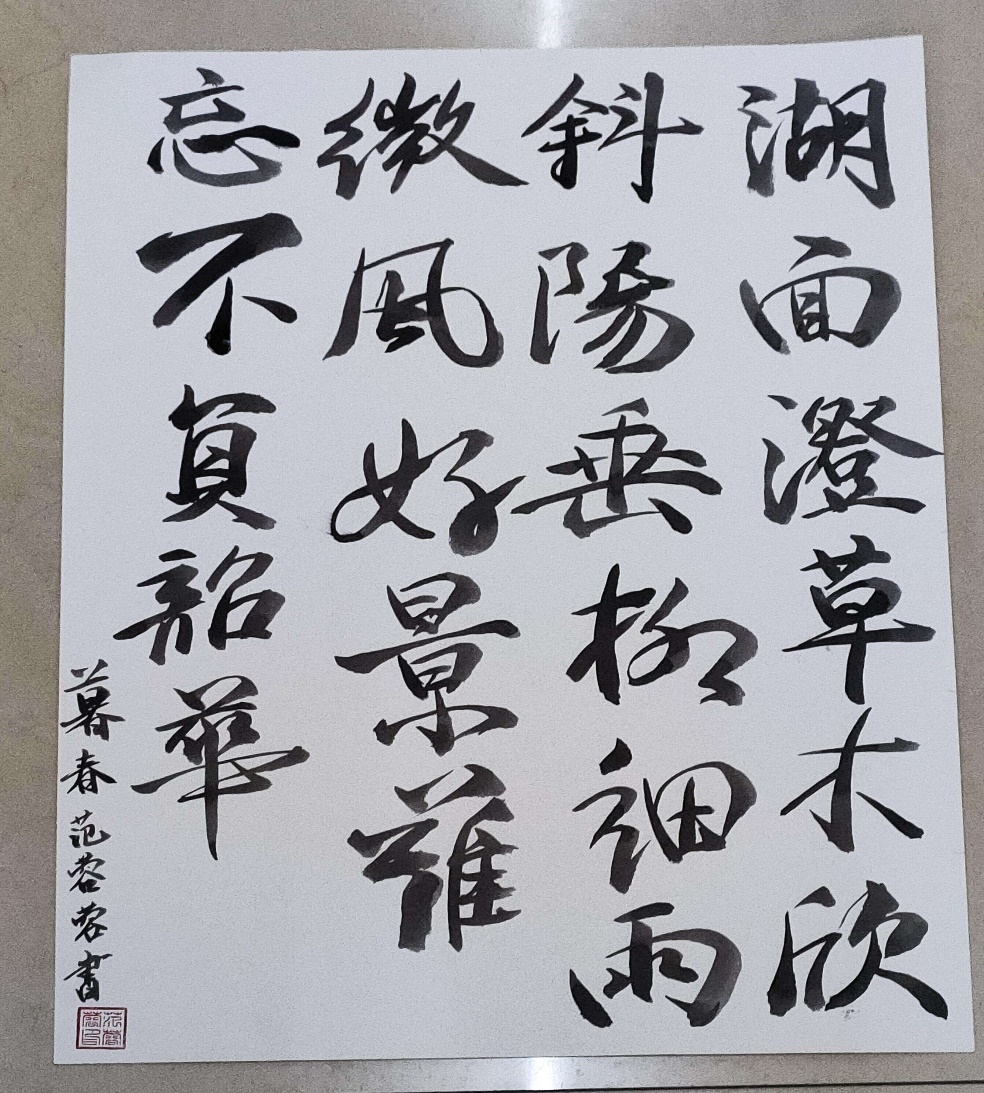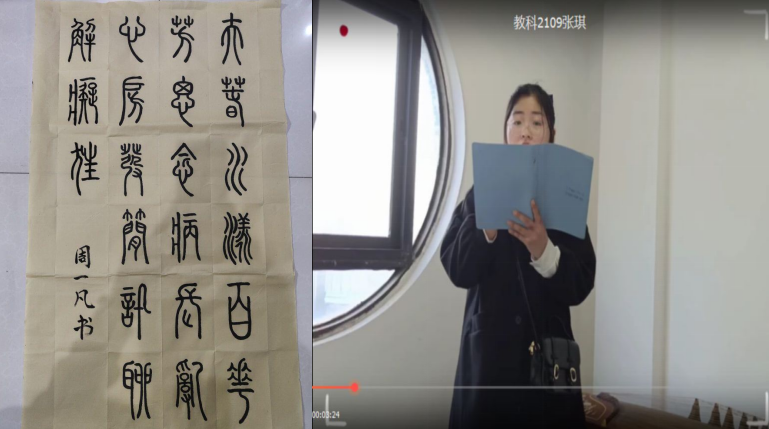 经过为期一周的线上征集,活动取得了很好的成效。许多同学踊跃参与其中,共赴这场春日之约,以多种多样的形式表达了自己对春分时令的体悟。如书法、诗歌等形式,提交的作品各具特色、情感真挚丰富。图为范蓉蓉同学的书法作品。书法苍劲有力,书写时行云流水,以自己的感悟,为我们描绘了她对春日风景的一番体验。而周一凡同学的小篆,处处流露出其深厚的书法功底,他自创的三行诗首句“夫春水漾百花芳”,以细腻的笔触,勾勒出春水之柔,百花之艳,为我们展示出了一副明媚又柔和的春景。而张琪同学,又用饱满的声音,为我们朗诵了一篇诗赋,以另一种方式抒发了自己对这明媚春日的感情。