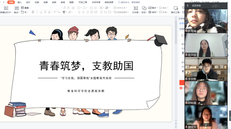 教科网4月7日电(记者 肖雨瑶 周宇晗)为认真贯彻落实全国教育大会、全国高校思想政治工作会议精神, 3月27日晚,“槐青”志愿服务部于线上举办“青春筑梦,支教助国”支教活动,号召广大青年把个人理想追求融入党和国家事业之中,将青春知识传授于儿童,让青春之花绽放于儿童心中。