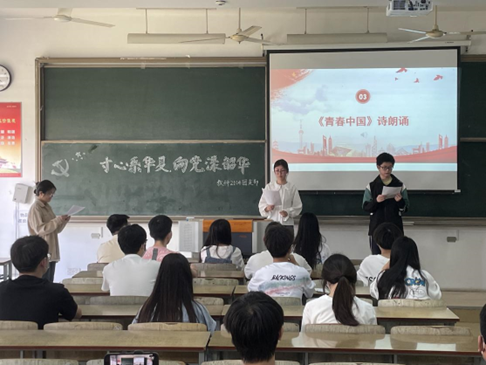 随后,朱沁怡、隽宇航两位同学带来诗朗诵表演,歌颂党和新中国的伟大成就,把对党和祖国的爱表达地淋漓尽致,铿锵有力的朗诵声展现了青年一代有理想、有担当的青春风采,更体现了青年学子对祖国的赤诚之心。一首朗诵,气势磅礴、慷慨激扬,彰显支部奋发向上、朝气蓬勃的青春风采。