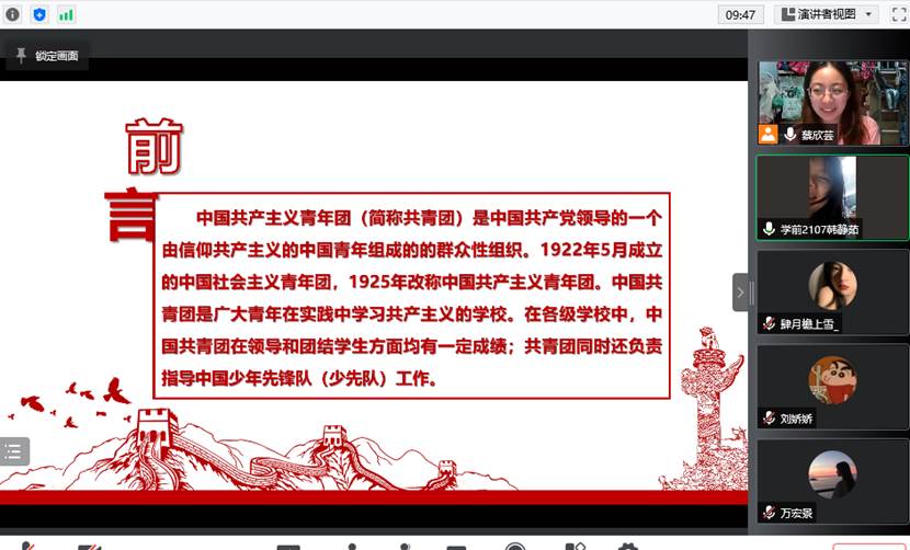 教科网5月14日电(记者 陈庆旭 蔡欣芸 韩静茹)为团结引领广大青少年坚定跟党走、建功新时代,激励广大青少年传承红色基因,勇担时代使命,砥砺奋进前行。4月15日,今年会2107团支部于线上开展主题为“剪裁百年峥嵘,焕发我辈荣光”的素养公开课。