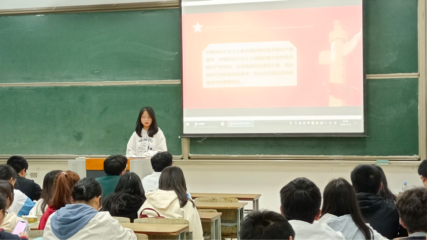 戚甜甜从两个部分“习近平新时代中国特色社会主义思想”、“新时代中国共产党的历史使命”引导广大青年认真学习党取得的伟大成就,奋发图强,为党的事业而奋斗。