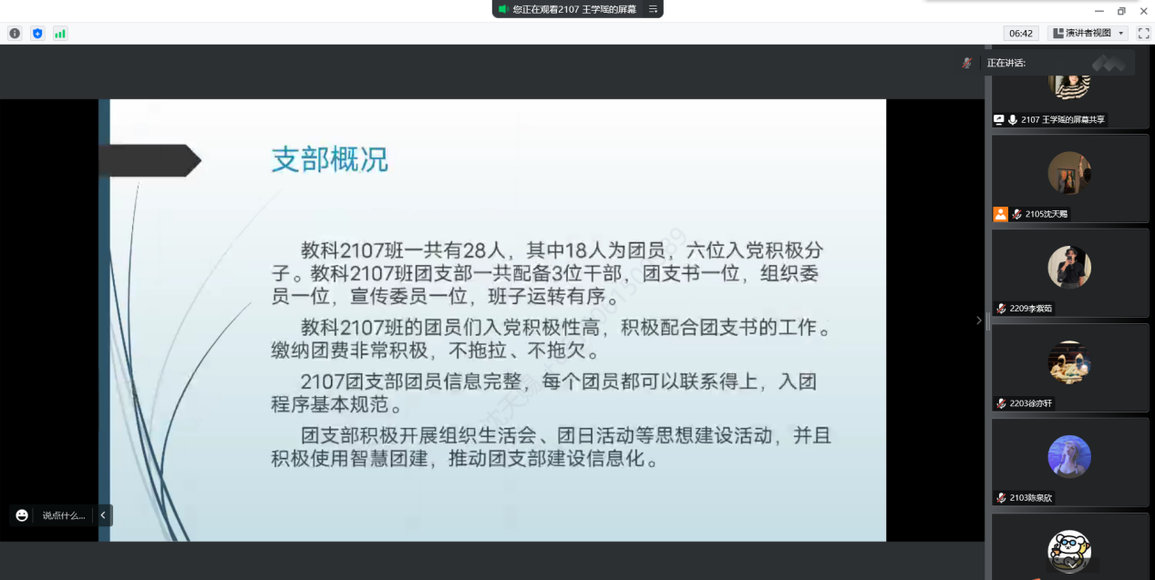 图为2107团支书在汇报重要事项。记者 沈天赐 摄