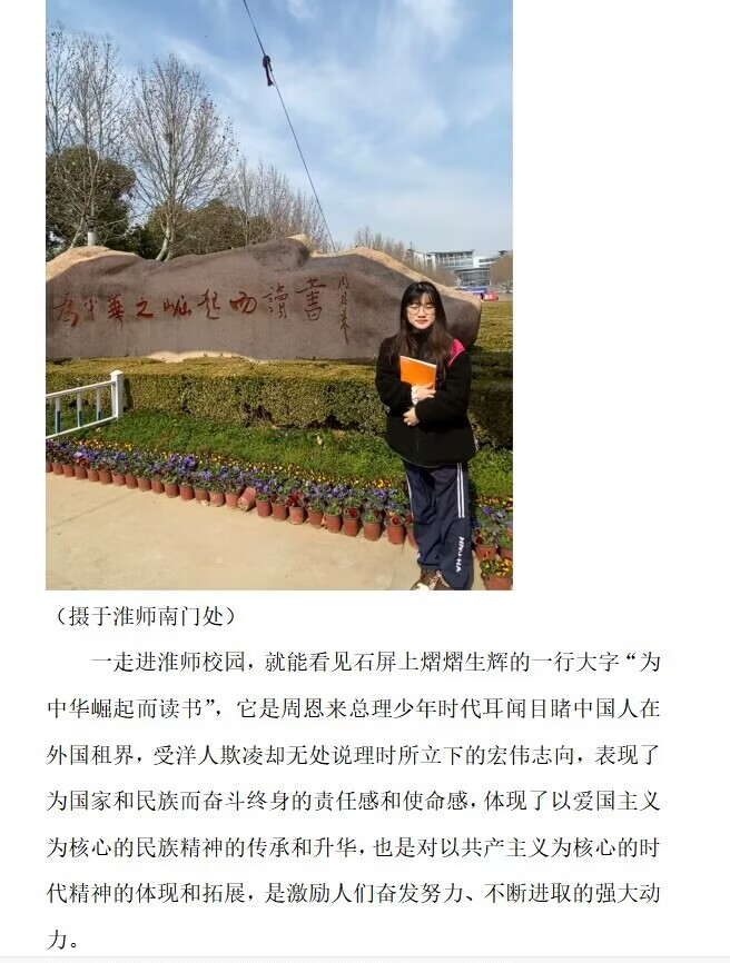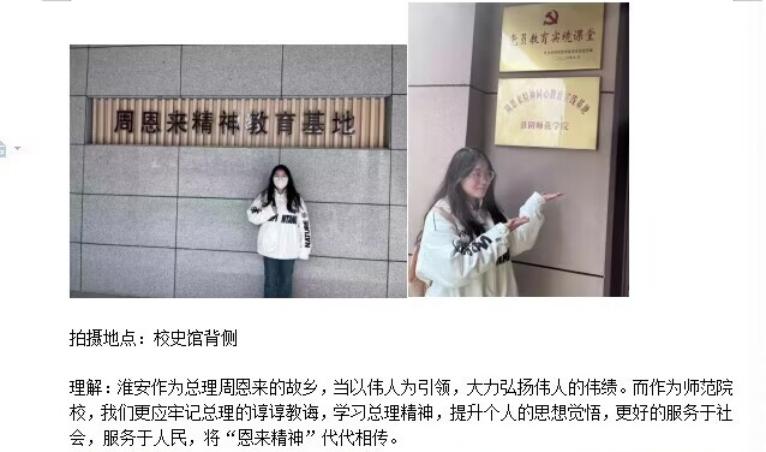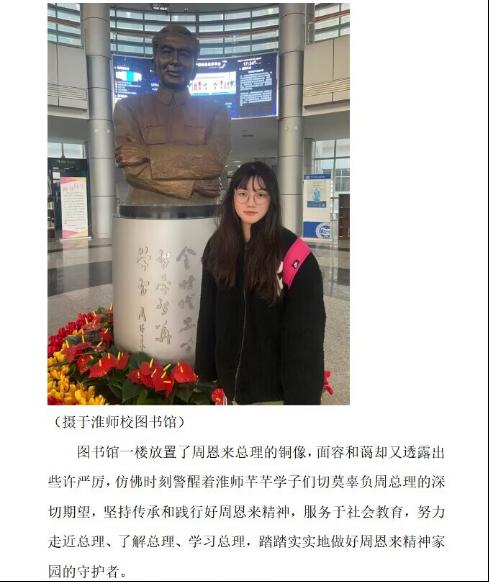 同学们走进图书馆、教学楼、校史馆,走遍校园的每一个角落,看到了墙上周恩来总理发人深省的名言,令同学们深有感触的照片,了解到了周总理的事迹与精神。周总理的优良作风和崇高品德将永远影响着我们淮师学子。