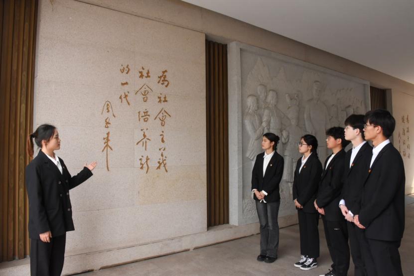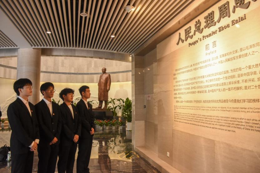 3月26日中午,所有成员身着正装,由团委外联部部长郭思悦带领乘车前往周恩来纪念馆。同学们先后参观了周恩来总理的汉白玉像、陈列馆和仿中南海西花厅。通过观实物、看照片,同学们领略了周总理年少时期“为中华之崛起而读书”的宏大志向和青年时期心系国家“邃密群科济世穷”立志救国的远大抱负。