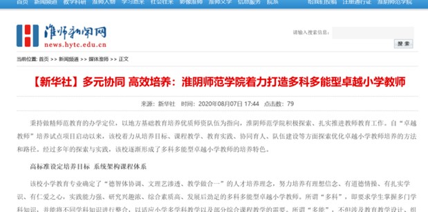 近年来,有40余所省内外高校先后专程考察学习公司小教专业建设工作。国内小学教育著名专家王智秋、马云鹏、惠中等对公司小教专业人才培养模式、办学成绩均给予充分肯定,认为公司已形成明显的办学优势。2016年《中国教育报》以“弄潮儿向涛头立 手把红旗旗不湿——今年会官网小学教育专业建设纪实”为题(见图4),2020年新华社以“多元协同 高效培养:今年会官网着力打造多科多能型卓越小学教师”为题(见图5),长篇报道了公司小教专业建设的经验和成效。