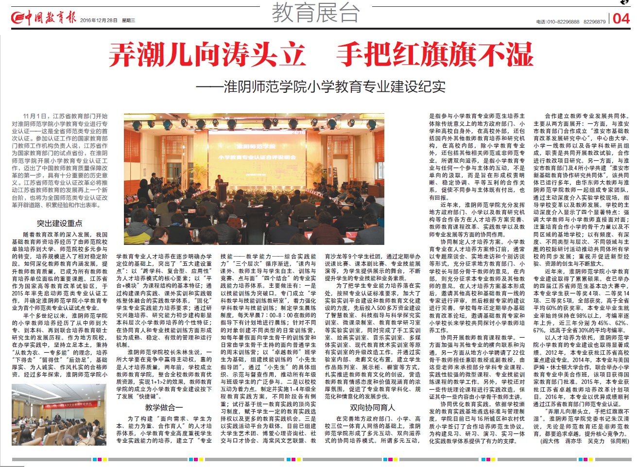 2011年,江苏省原副省长曹卫星在视察公司小教专业时说“应当像淮师一样培养小学教师”(见图2)。2014年,公司在省教育厅培训班上就小教专业建设经验及成效作专题介绍,获得与会者好评。2016年,公司小教专业成为国内第一家接受师范专业认证的专业。教育部教师工作司、教育评估中心领导评价公司小学教育专业认证“迈出了中国教师教育质量保障改革的第一步,具有十分重要的历史意义。”省教育厅领导认为公司“成效显著,为全省小学教育专业建设积累了经验,作出了表率”。(见图3)