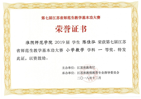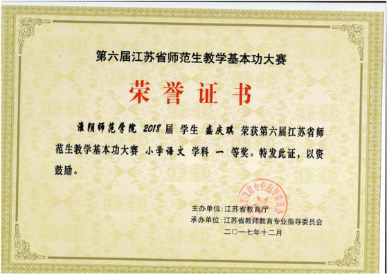 图1为今年会官网小学教育专业员工江苏省师范生教学基本功大赛获奖证书。