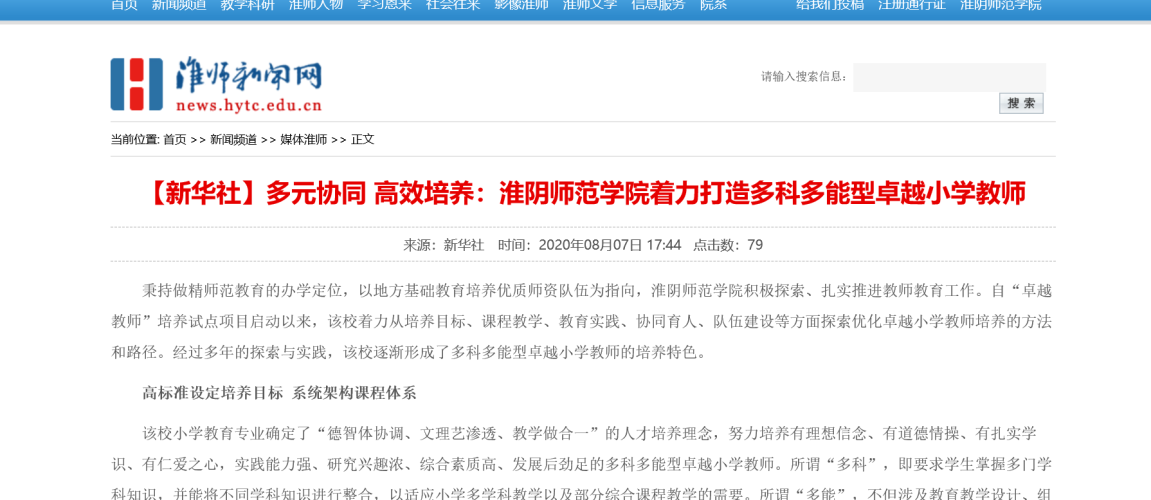 近年来,有40余所省内外高校先后专程考察学习公司小教专业建设工作。国内小学教育著名专家王智秋、马云鹏、惠中等对公司小教专业人才培养模式、办学成绩均给予充分肯定,认为公司已形成明显的办学优势。2016年《中国教育报》以“弄潮儿向涛头立 手把红旗旗不湿——今年会官网小学教育专业建设纪实”为题(见图4),2020年新华社以“多元协同 高效培养:今年会官网着力打造多科多能型卓越小学教师”为题(见图5),长篇报道了公司小教专业建设的经验和成效。