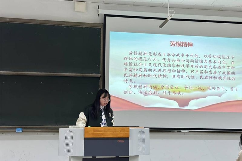 冯淑媛同学从劳模精神内涵切入,向大家列举了极具代表性的劳动模范人物,号召新时代青年,要积极学习劳模们爱岗敬业、艰苦奋斗、甘于奉献的精神。用自己的生命在平凡的岗位上,以最踏实艰辛的劳动,绽放出堪与“牡丹”争辉独属于“苔花”的光彩。