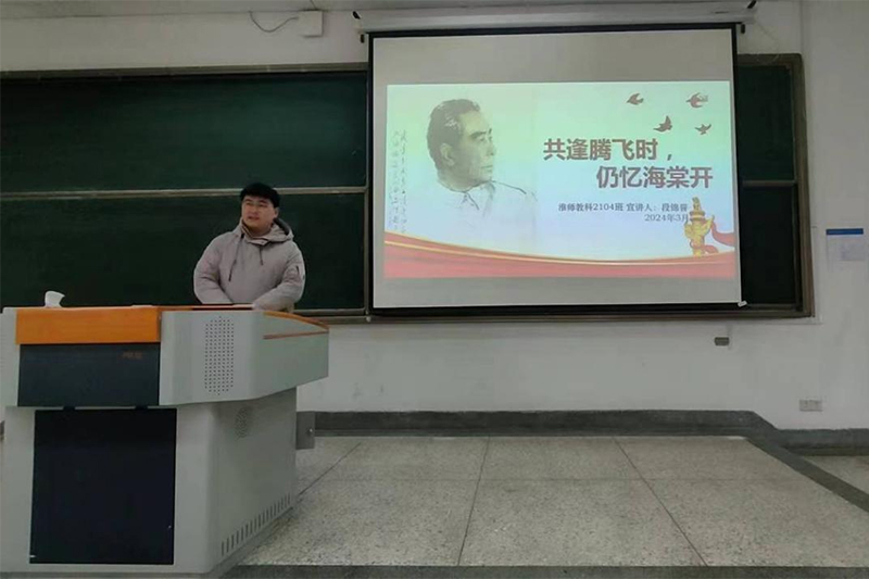 第二位上台展示的是教科2104班的段锦誉同学,他的微课题目为“共逢腾飞时,仍忆海棠开”。他用激昂的语调,优美的辞藻,向我们介绍了周总理一路走来的艰辛,与和他命运深深相连的爱国情怀。