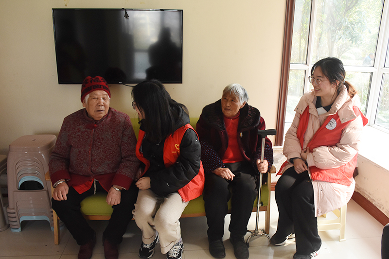 图为志愿者与老人唠嗑。记者 李纤忆 摄