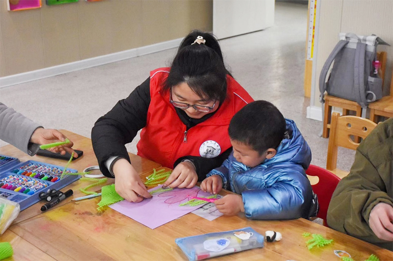 志愿者们来到淮安市博爱康复中心,和小朋友们进行互动,共同完成手工作品。他们和小朋友们共同装饰心愿板,将写满心愿的便利贴贴在白板上,并在白板上绘画来进行装饰,志愿者们鼓励孩子们自由探索和尝试,通过艺术的力量,建立更为丰富和多元的世界观。接着,他们陪小朋友们一同“变废为宝”,将泡沫条装饰城杨柳画,让小朋友们在动手的同时也学习到环保知识。随后,志愿者们在给小朋友们讲故事的同时,手把手教他们认识故事中的汉字,一次短暂的陪伴不仅为小朋友们带来温暖与关怀,也增进了志愿者与他们之间的交流。