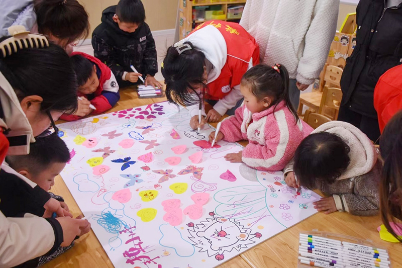 活动最后,志愿者们和小朋友共同展示了他们合作的劳动成果,小朋友们用各色颜料精心填色,绘制出他们内心的世界,展现了他们丰富的想象力和创造力。