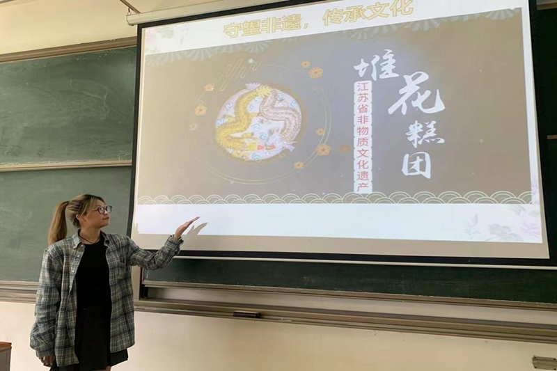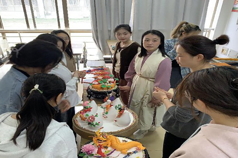 活动伊始,华娟萍向同学们介绍了糕团堆花的传承故事以及制作材料和基本步骤。以“龙凤呈祥”“年年有余(鱼)”等经典作品为例,通过实物展览的方式,让同学们有机会近距离观察、触摸、感受糕团堆花这门传统技艺。