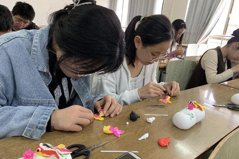 图为同学们在认真制作“年年有余(鱼)”作品。记者 徐亦轩 摄