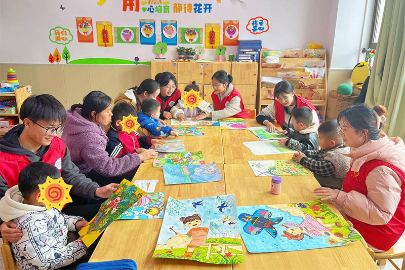 图为志愿者们为孩子们讲解画作。记者 衡静文 李依婷 摄