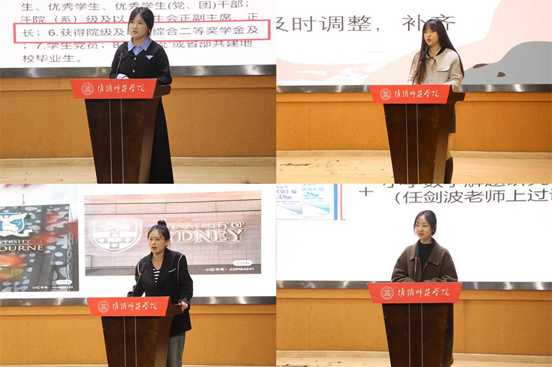 王萌、许安琪、陈伊婷、荣逸等4位同学结合自身经验,就出国留学offer申请、江阴南通南京无锡等地区教师编制招考、研究生准备等多个高层次就业渠道进行了深入分析和探讨。