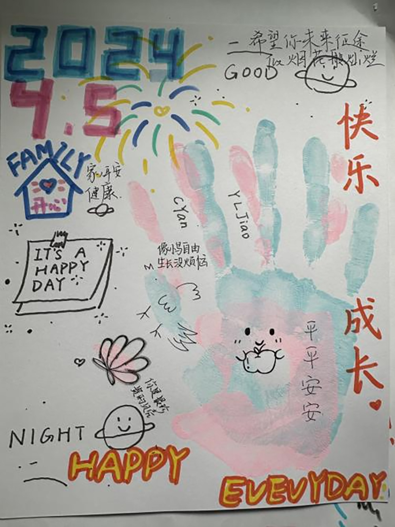 本次活动分为两个部分,活动一:“请和我击掌”参赛者以 A4纸为底板,在上面描画上自己的手印,请朋友、家人、老师用自己喜欢颜色的笔将自己的手掌描画在参赛者手印的上面,写上了他们的祝福、期望与签名,写上对自己未来的展望与寄语,参赛者们还利用自己的巧思对作品进行装饰,将激励内化于心,外化于行,更好地学习与生活。活动二:“小小书签,穿越未来”参赛者自行完成书签制作,在书签上写下自己喜欢的一句话,或者是座右铭等。小小的一枚书签,承载着同学们对未来的无限向往。