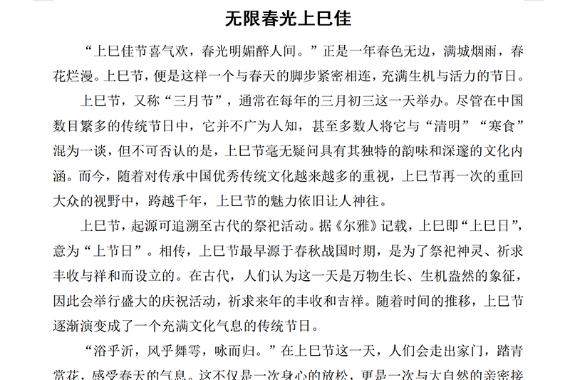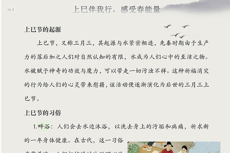 参加的同学们以“上巳节”为活动主题,可以选择多样的活动形式,例如:PPT,亦有多样的征文表现形式。两类活动形式不限,同学们将发挥想象与创造性,表达出自己心中对于上巳节的了解和认识。
