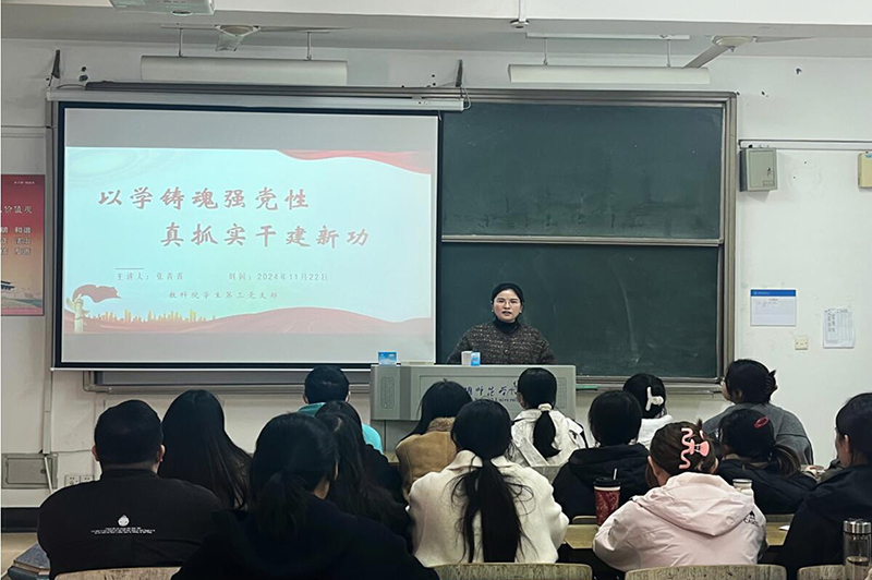 张菁菁以“以学铸魂强党性,真抓实干建新功”为题,从学思想、强党性、重实践、建新功四个方面展开。张菁菁指出,做一名合格的共产党员首先要学思想,要加强理论武装,把廉政建设摆在首位,练就共产党人的“铁骨”,修好共产党人的“心学”,做到“咬定青山不放松”,永远不忘初心来路,坚定不移听党话、跟党走。第二,要强党性。张菁菁号召全体党员通过学习锤炼思想品格,坚定对马克思主义的信仰,对中国特色社会主义的信念,对实现中华民族伟大复兴中国梦的信心,做到不忘初心、牢记使命,谦虚谨慎、艰苦奋斗,不断强化党性修养。第三,要重实践。张菁菁鼓励全体党员要践行实事求是,做到自身正、自身净、自身硬,在实践中弘扬党的优良传统和作风,充分发挥党员的先锋模范作用。第四,要建新功。张菁菁明确建新功就是要学习贯彻习近平新时代中国特色社会主义思想,在解放思想、开阔视野,破除阻力、革故鼎新,刀刃向内、从严治党等方面开展伟大的自我革命,从而推动伟大的社会革命不断向前。