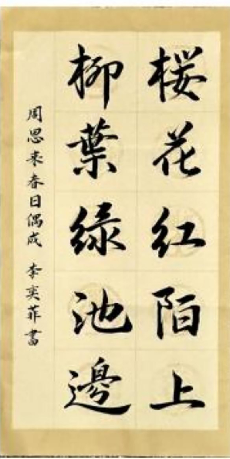 第三幅毛笔字作品描绘的是“樱花红陌上,柳叶绿池边”。细腻柔美的笔触勾勒出一幅春日美景图,樱花如雪般飘落,杨柳依依垂岸,充满了生机与诗意。它既是对自然美的礼赞,也是对美好生活的向往。