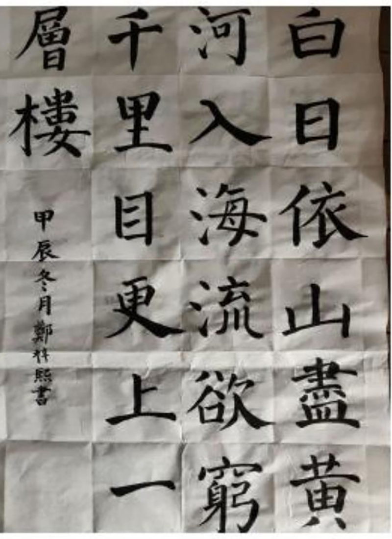 这一幅毛笔字作品则选取了王之涣的《登鹳雀楼》:“白日依山尽,黄河入海流。欲穷千里目,更上一层楼。”这几句诗被书写得气势恢宏,给人以无限遐想的空间,似乎能感受到夕阳西下的壮丽景色与诗人渴望探索未知世界的雄心壮志。