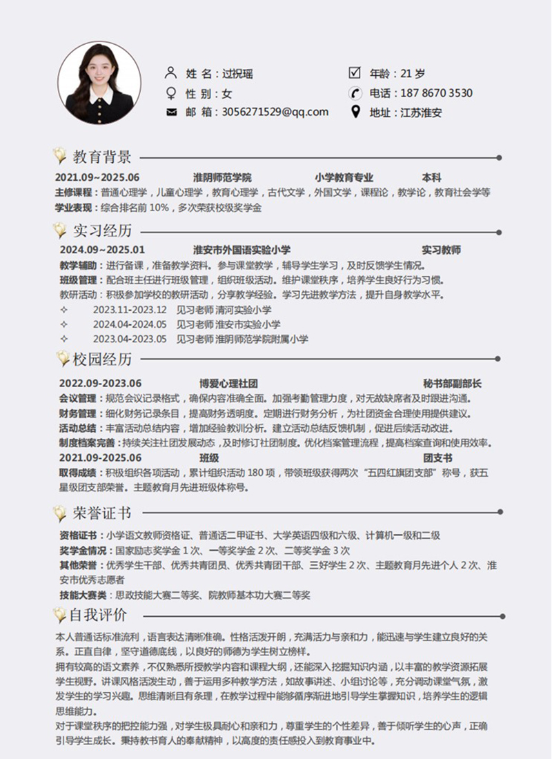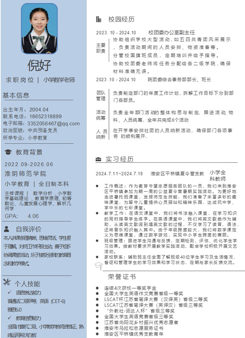 同学们都为此次活动做了精心的准备,提供了许多优秀的简历制作。倪好同学采用蓝白分区的形式,简洁精练地介绍了其基本信息与优势,并着重呈现其校园经历、实习经历、荣誉证书。过祝瑶同学用清晰的排版整体展示了其个人信息、个人经历以及荣誉证书等。