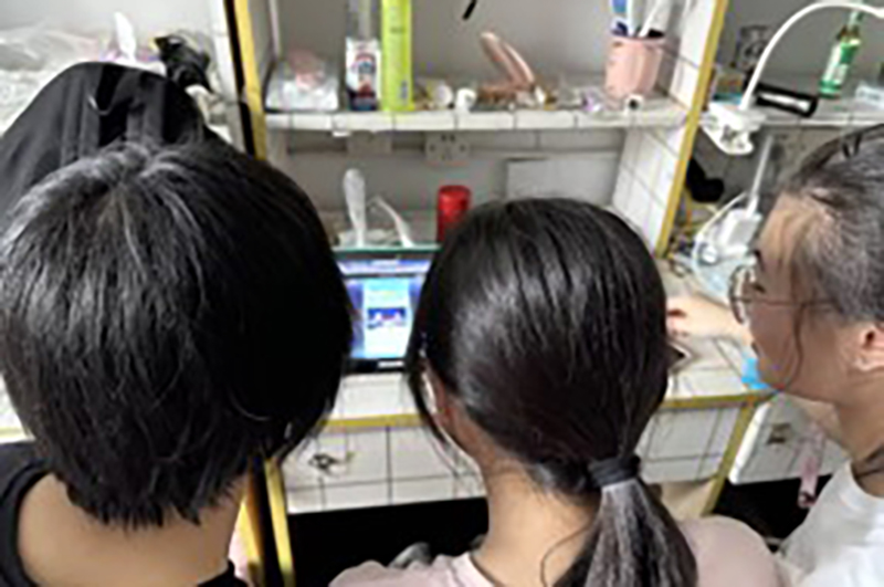 图为员工在观看员工分享会。记者 曹婉晴 摄