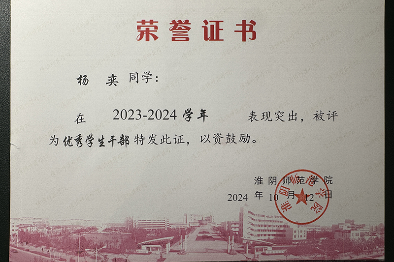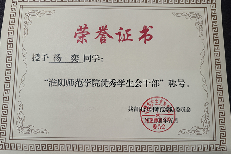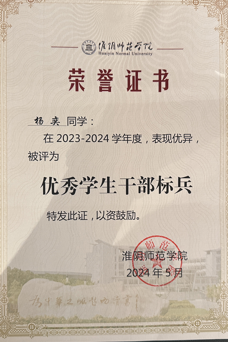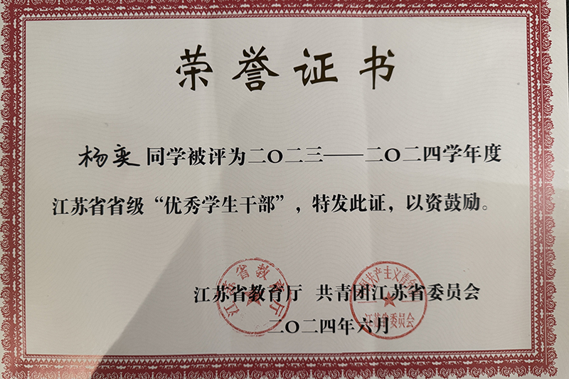 她还积极参与院员工会工作,担任院员工会执行主席。在这个岗位上,她以高度的责任感和卓越的领导力,带领团队出色完成了多项工作。她注重团队协作与发展,提升了工作效率,增强了同学之间的凝聚力。她的领导风格严谨认真,却又不失温情,赢得了同学们的尊敬和爱戴。在工作中,她以身作则,生活中关心同学,成为了员工群体中的一面旗帜。她的努力和付出,得到了应有的回报。因其出色的表现,杨奕被评为“江苏省优秀员工干部”“校优秀员工干部标兵”“校优秀员工会干部”等荣誉称号。这些荣誉不仅是对她过去努力的肯定,更是对她未来成长的激励。她用自己的行动诠释了什么是责任、什么是担当。她的青春,因奋斗而精彩,因奉献而闪耀。在未来的日子里,她将继续以青春之我,创造属于自己的辉煌篇章。
