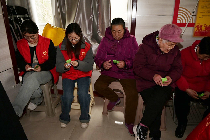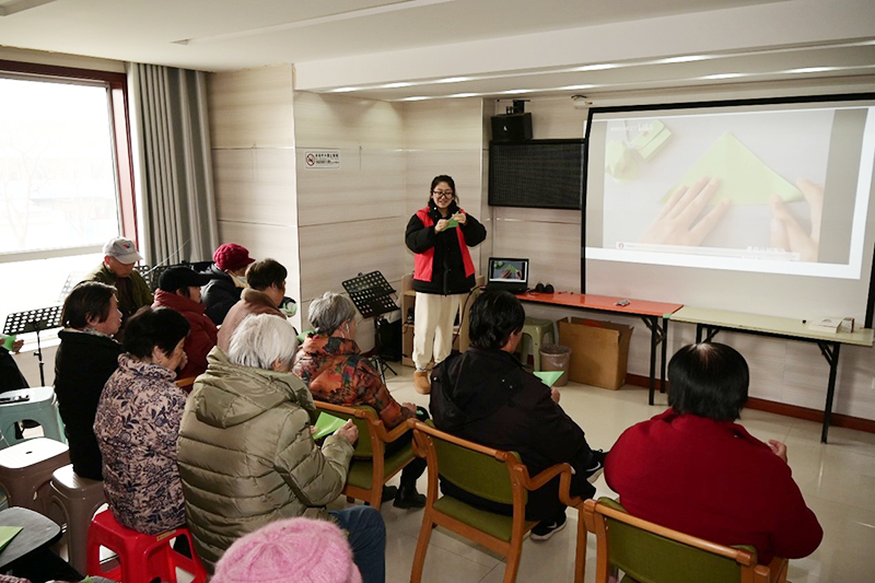 在本次活动中,同学们带来了绿色的折纸,志愿者们教那里的老人们如何折出红军挎包,表达一片心意。同学们或播放教学视频,引导老人们折出挎包;或弯腰站在老人一旁,耐心地教他们折纸;或蹲在老人身前,一点一点地告诉他们该怎么折。在这个温暖的日子里,在这个春暖花开的季节,关心老人们,与其同乐,让他们的世界获得一份真情和浓浓的暖意。