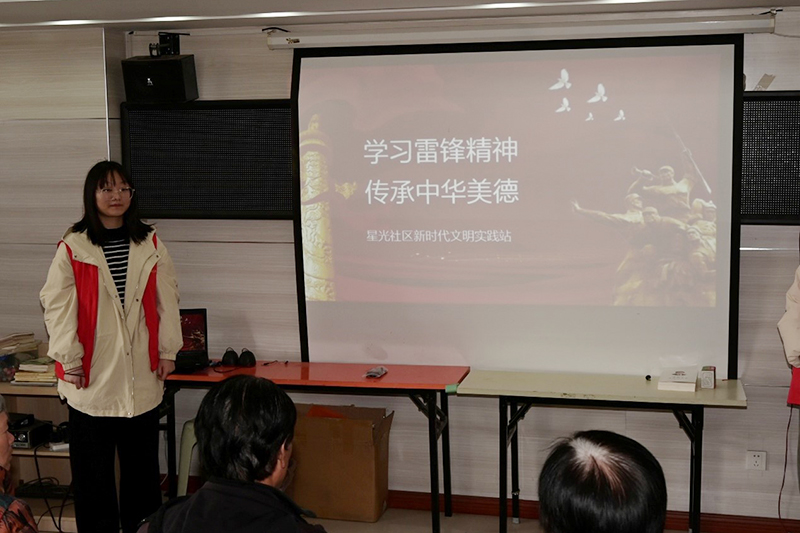 在3月13日,志愿服务部的志愿者们前往了淮安市北京如意国际花园星光社区,向那里的老人们进行雷锋主题的ppt宣讲。志愿者们与老人们一同了解了雷锋精神的内涵,为他们讲述雷锋的故事,展现生活中怎样去践行雷锋精神,表达对雷锋精神多元的理解。听着这些关于雷锋的事迹,老人们慈祥的脸上都露出深受触动的表情。