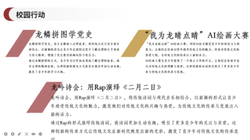 此外,“龙舞春华·周公风华录”PPT创作环节也备受瞩目。同学们以传统文化为主题,创作了内容丰富、形式多样的PPT。他们深入探讨了二月二龙抬头的起源、习俗和文化内涵,同时融入了与周恩来总理相关的传说故事,使PPT作品既具有学术性又不失趣味性。