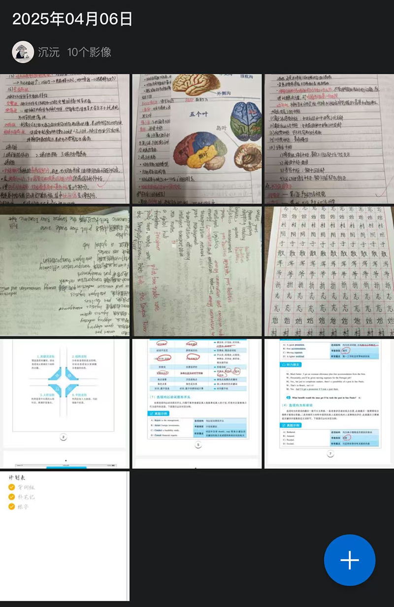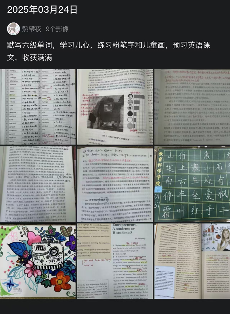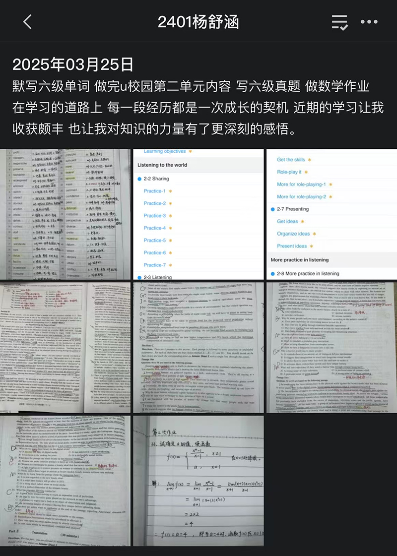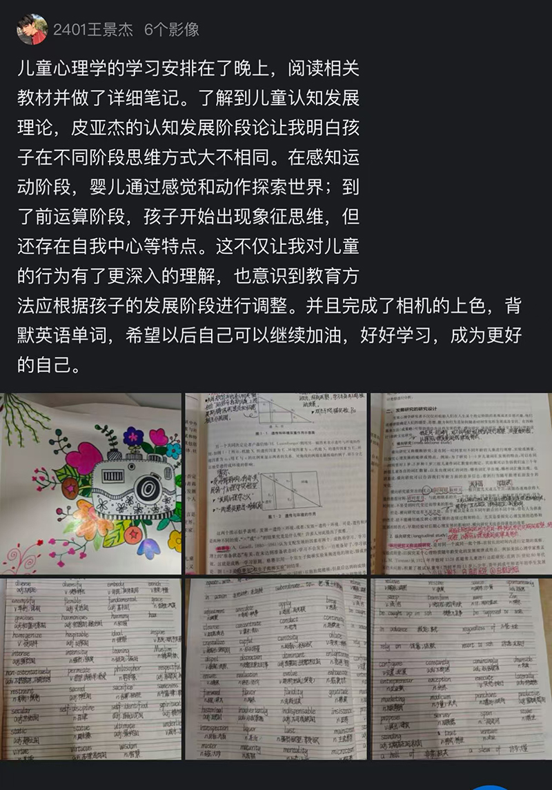 打卡内容丰富多样,精彩纷呈。从对教育心理学、教育学原理等专业课程的深度钻研,到为英语四六级考试紧张备考,从一笔一划精心练习粉笔字,到用心勾勒儿童画,无一不体现出同学们对学业提升的强烈渴望与全面发展的积极追求。2401班杨舒涵在打卡中分享道:“每日坚持默写六级单词、完成u校园单元任务、攻克数学作业,在这一过程中,愈发深刻地领悟到知识蕴含的强大力量。” 2405班刘倩雯所展示的学习笔记,字迹娟秀工整,标注细致入微,充分展现出其对专业知识抽丝剥茧般的深入思考。当然,不只有他们,还有许许多多的同学积极参与,分享自己的学习活动。