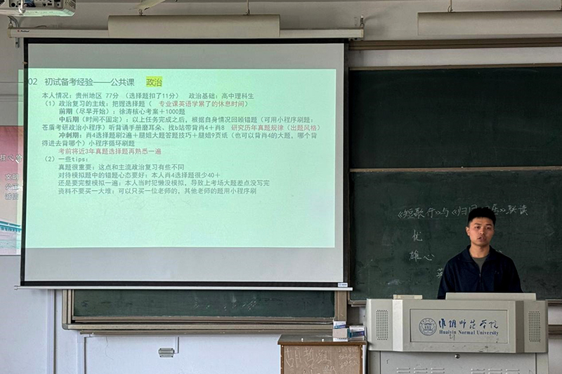 在提问环节,现场气氛热烈,同学们积极踊跃地提出自己心中的疑问,学长学姐们都给予了耐心而详尽的回答。2201班周柯柯在分享会结束后表示:“这次分享会就像一场及时雨,让我在迷茫的备考路上找到了方向。学长学姐们的经验分享让我受益匪浅,不仅让我明确了备考方法和策略,还让我更加坚定了考研的信心。我会借鉴他们的经验,努力实现自己的考研梦想。”