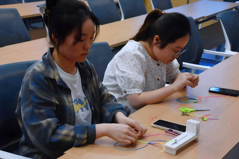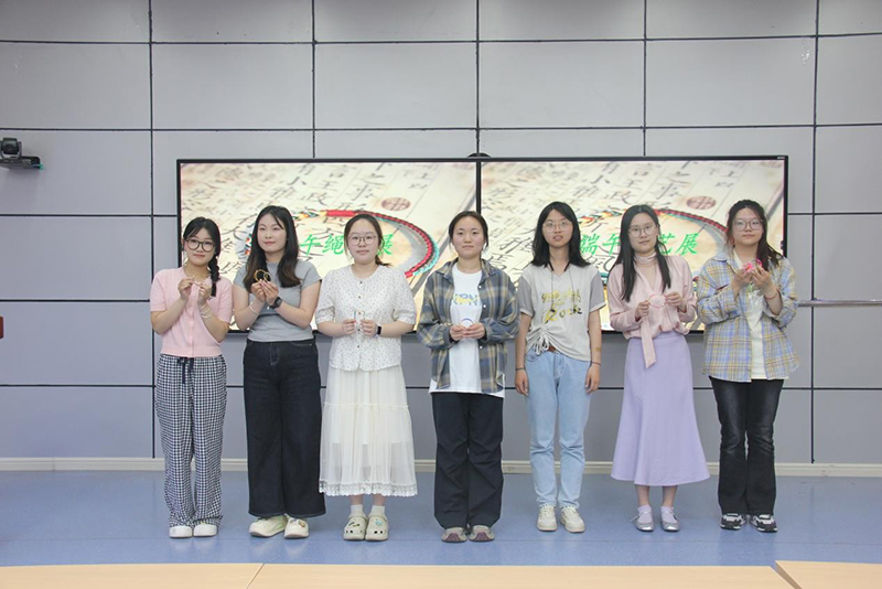 活动伊始,欧阳馨秋聚焦"端午绳艺展"和五彩绳的文化展示,详细解析了五彩绳的五行象征意义、平结和蛇结的编织方法及其作为"长命缕"的文化传承价值。在动手环节,彩绳、丝线等材料琳琅满目,同学们发挥个人创意,将平安结、吉祥结等传统元素融入设计中。大家相互交流编织技巧,分享创作灵感,在协作中体验手工艺术的乐趣。一根根五彩丝线在指尖穿梭,逐渐变成寓意驱邪祈福的端午手绳,既展现了传统工艺的精巧,也体现了同学们的匠心独运。