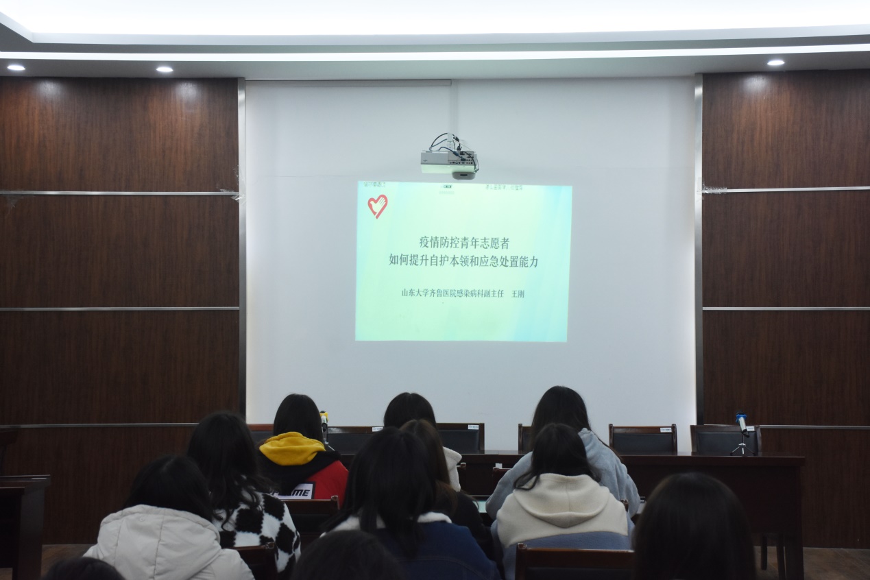 在本次培训直播中,山东大学齐鲁医院感染病科副主任王刚介绍了疫情防控的相关知识,从当今全球抗疫的整体情形切入,着重与疫情防控志愿者分享了应如何提升在防疫志愿服务活动中的自护能力和应急处理能力。培训全程严格按照疫情防控的相关要求,到场的员工骨干志愿者全员佩戴口罩,分散就坐,认真听讲,明确工作目标,切实提高认识。