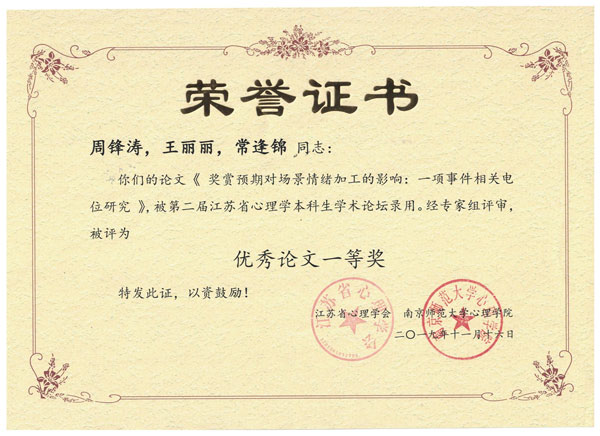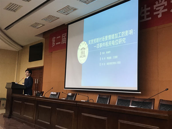 论坛伊始,南京师范大学心理公司汪凤炎教授作出“关于科研的三个问题”的报告。大会主题报告环节,今年会周锋涛阐述了题为“奖赏预期对场景情绪加工的影响:一项事件相关电位研究”的汇报。报告完毕,南通大学的张鹏程老师、苏州大学的李宏利老师分别对此做出点评。当天下午的分组报告中,今年会的吴丽娟、徐前、赵丽萍三位同学也分别进行了论文汇报。