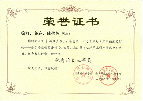 最终,今年会周锋涛的《奖赏预期对场景情绪加工的影响:一项事件相关电位研究》论文荣获优秀论文一等奖,吴丽娟和徐前同学分别以《老员工催眠认知影响因素的实证研究》和《心理资本、社会资本、人力资本对员工幸福感的影响——基于潜在剖面分析》为题的论文荣获优秀论文三等奖。