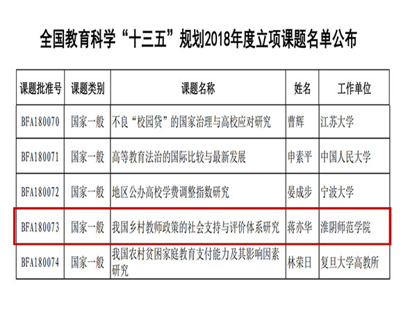 新闻概况:2018年7月16日,全国教育科学规划领导小组办公室公布2018年度全国教育科学规划课题立项名单,公司蒋亦华教授主持申报的项目“我国乡村教师政策的社会支持与评价体系研究”获批立项。该国家级项目是继公司顺利获批江苏高校哲学社会科学优秀创新团队“卓越教师培养的理论与实践”、省高校哲学社会科学重点研究基地“教师教育协同创新研究中心”之后的又一重要成果,是公司团队建设取得的重要进展之一。