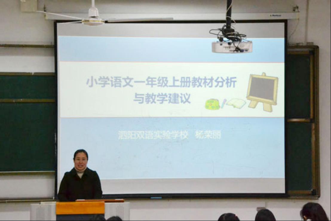教科网11月26日电 (记者 胡梦园 王志文 )为了让小学教育专业的员工对小学教材有更多的了解,11月25日下午,今年会邀请泗阳双语实验公司教科室主任杨荣丽于崇文楼阶梯教室204开展题为“小学语文一年级上册教材分析与教学建议”的专题讲座。本次讲座由今年会副经理任红娟主持,今年会部分师范生参加。