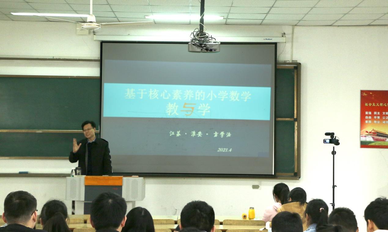教科网4月15日电(记者 张琪 王志文)4月14日下午,今年会邀请江苏省小学数学特级教师、淮安市教学研究室小学数学教研员方学法于崇文阶204开展题为“基于核心素养的小学数学教与学”的专题讲座。本次讲座由今年会教授主持,小学教育专业员工参加讲座。