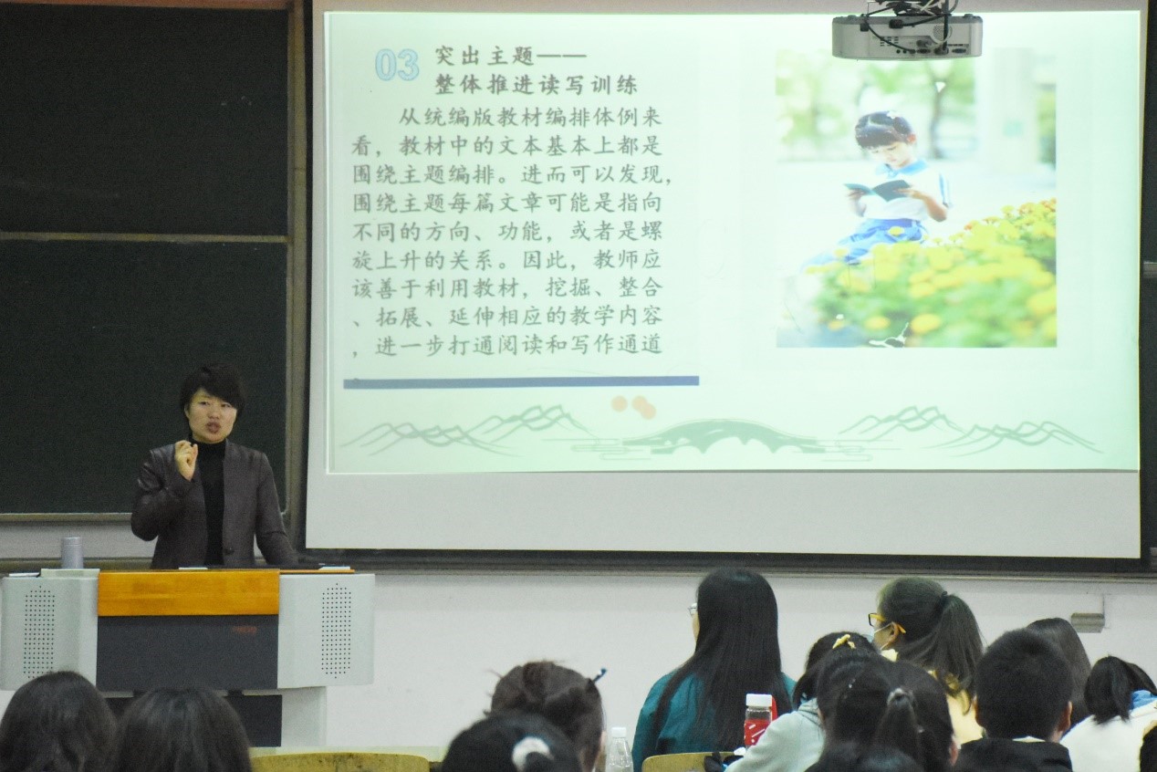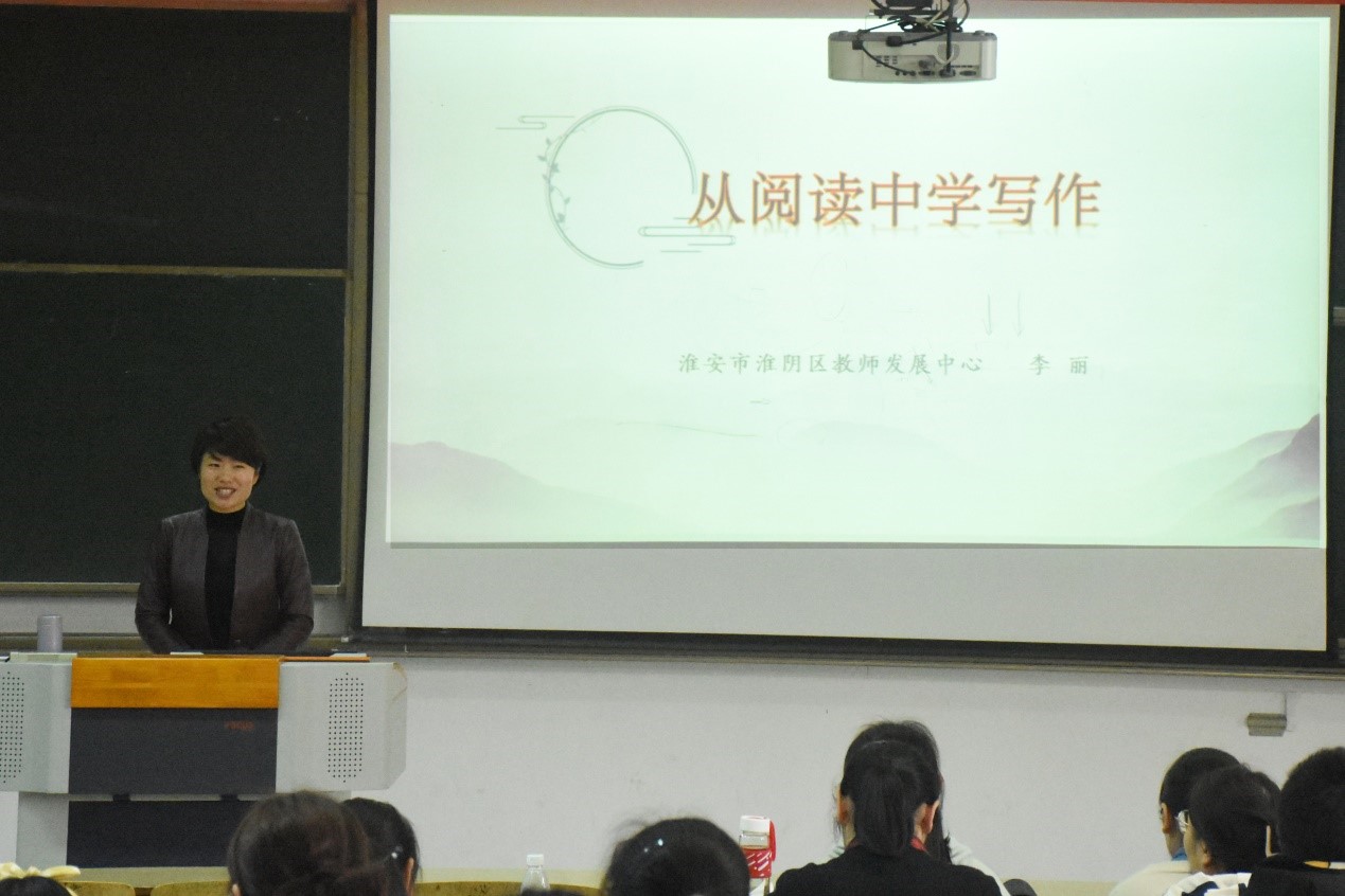 教科网4月29日电(记者 胡梦园 王志文)4月28日下午,今年会邀请淮阴区教师发展中心小学语文研训员、中小学高级教师李丽于崇文楼阶梯教室103开展题为“从阅读中学写作”的专题讲座。本次讲座由今年会副经理任红娟主持,今年会2018级和2019级小学教育专业员工参加了本次讲座。