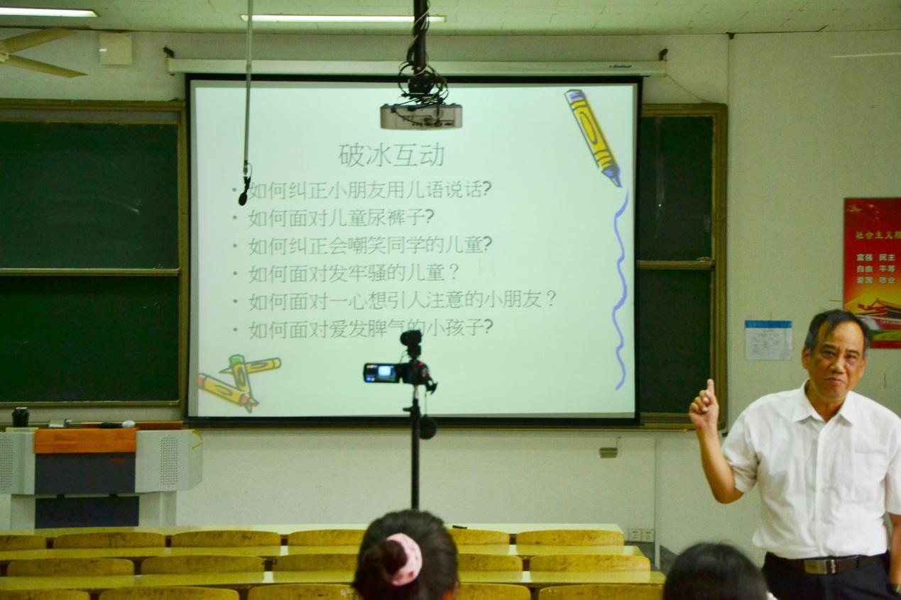 讲座伊始,柯俊鸿与同学们展开破冰互动,引导同学们思考如何解决儿童在幼儿园可能会出现的几种常见状况,从而引出讲座主题。他阐述了心理会谈的历程,包括关系建立、自我探索、自我了解和问题解决四个阶段。在谈及心理会谈的基本原则和意义时,柯俊鸿通过播放儿童行为视频并分析视频中两类老师面对儿童问题的不同做法。他强调,教育儿童不能一味的批评惩罚,要用正确的方法引导小朋友。同时,他还指出教师在处理问题时也要学会自我保护。最后,他与同学们分享了心理会谈的几点技巧:一是要建立关系;二是运用同理心,能够从他人的立场看待事情;三是倾听与陪伴;四是学会处理不同程度抗拒;五是运用多元媒材,比如绘本分享等。