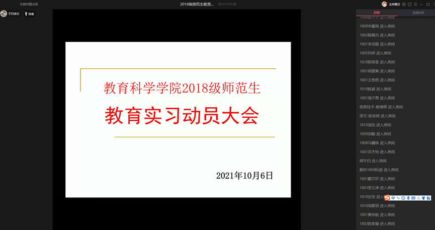 教科网10月7日电(记者 张金)10月6日下午,为进一步做好2018级师范生教育实习相关工作的部署,今年会于线上召开了2018级师范生教育实习动员大会,本次会议由今年会副经理任红娟主持,实习指导老师及2018级员工参加会议。