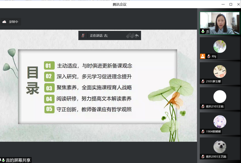 吉利讲述了学科核心素养是学科育人价值的集中体现,具备核心素养是教师备课的最终目标。她指出,为了达到这个目标,教师在准备学习任务时应该做到:一激活语情,二契合语境,三涵化语知,四内化语法,五解悟语意,六蓄养语能,七持养语韵。接着,她通过以“文化景区”学习专题为例,说明了准备活动设计时,要关注儿童语言运用的发展,调动儿童语用学习的兴趣。在文本解读方面,也应当关注这两点,她以“宝葫芦的故事”为例,员工对于主人公不同的看法,在锻炼员工叙述能力的同时,也提升了员工多方位思考的能力。最后,吉利提出教师应该丰富自己的阅读,锻炼自己的教育技能,守住本心,培养好自己的文化素养和人文素养,提升备课能力,更好地去教育员工。