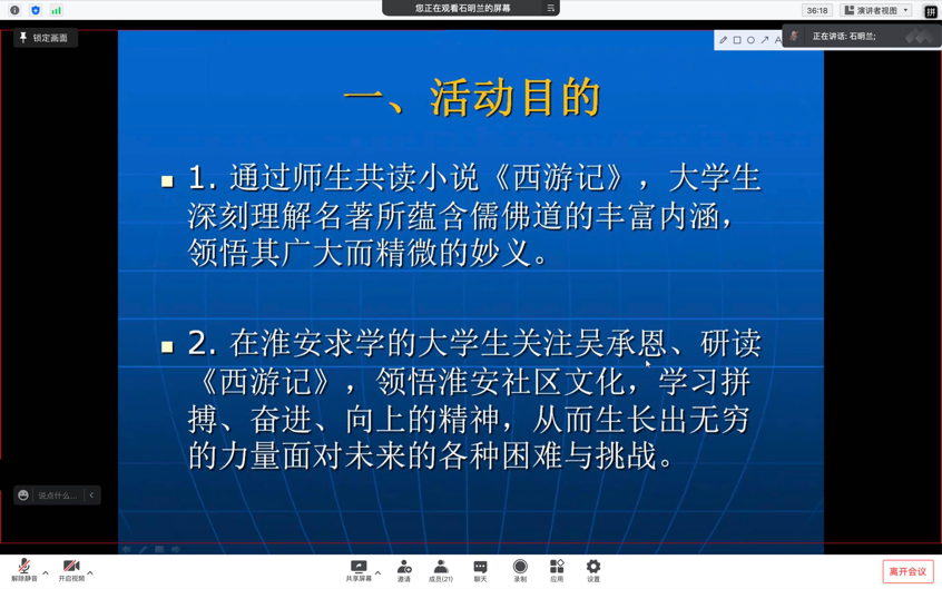 教科网5月27日电(记者 殷雨清 吕心语)为了营造良好读书氛围,培养同学们良好的阅读习惯,深化公司“一课一本”活动的开展,今年会于5月25日晚7点在线上开展“师生共读一本书”第四期分享会。本次分享会由今年会官网副教授石明兰老师主讲,同学们通过线上直播观摩活动。
