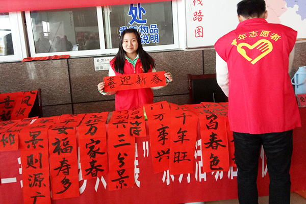 图为教科志愿者在贵州省镇宁自治县为旅客写春联。记者 燕浓蝶 摄